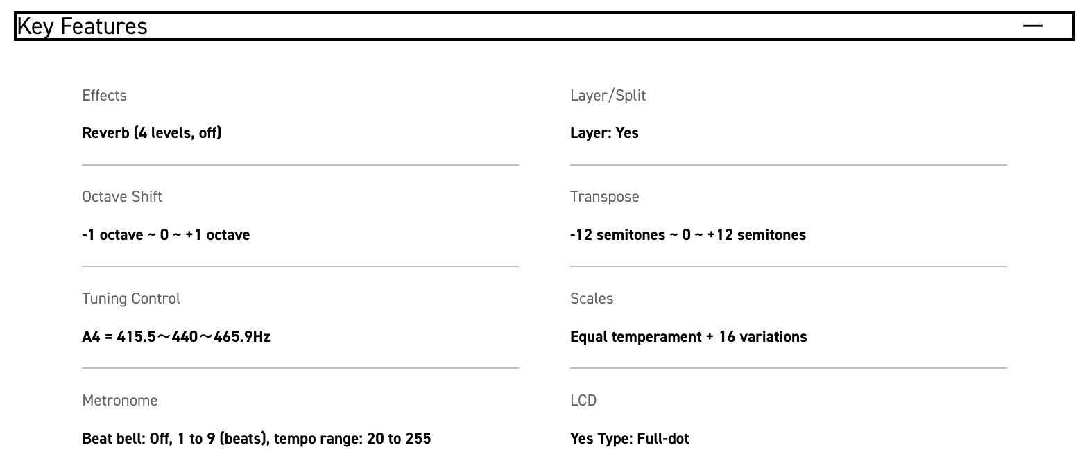 - Tuning: Adjust the tuning in 0.1Hz increments to match other instruments or vocals